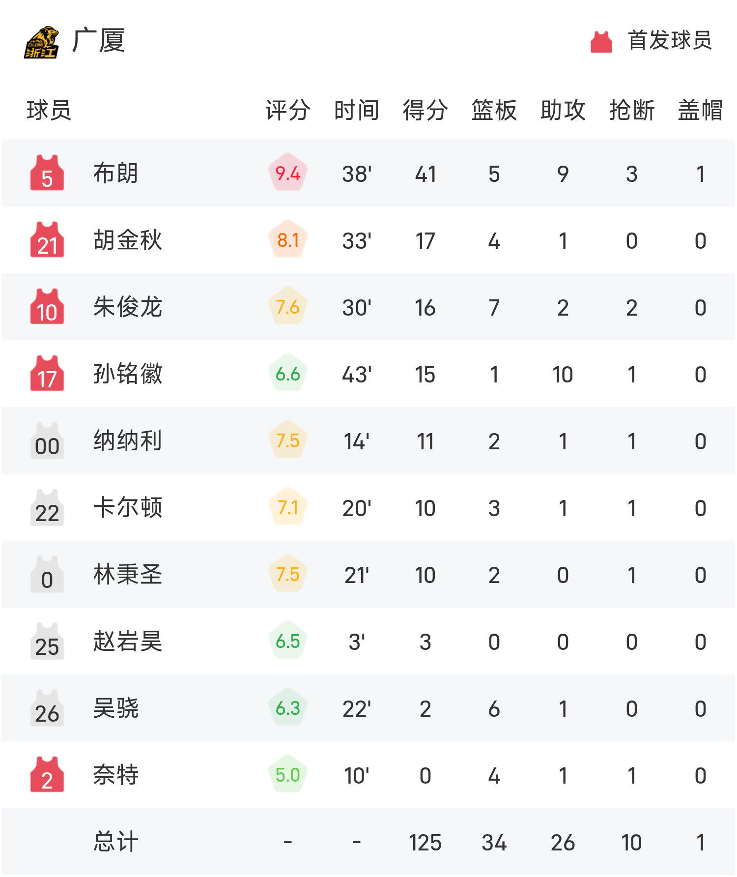 05月20日讯 24/25赛季CBA 季后赛 总决赛,北京对阵广厦。双方全场战罢,北京118-125不敌广厦。布朗砍下全场最高的41分5板9助,率领广厦成功取胜,广厦4-2北京拿下总冠军。